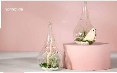 Springtide Air Plant Item Dimensions: 3.5†× 3.5†× 7†1.Height includes plant. Size may vary by variety. 2.Two (2) designs varieties: bird or plant 3.Glass vase with moss, white stone and twi